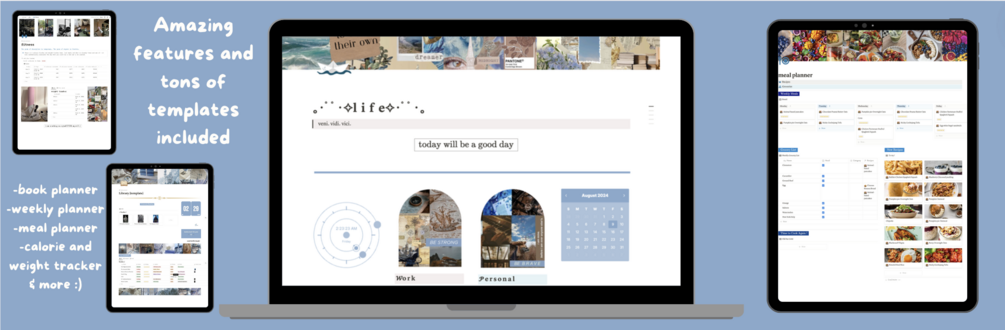 You'll get a weekly planner, meal planner, a book tracker, and calorie and weight tracker. There is also a budget tracker and pomodoro timer. You'll learn how to add widgets as well.